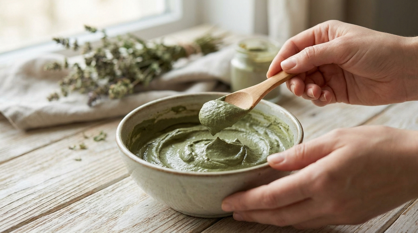 Pour réussir votre cataplasme argile verte pour kyste, versez la poudre dans un bol en verre. Ajoutez l’eau sans mélanger brusquement. Laissez reposer pour que la terre s’imbibe seule.
