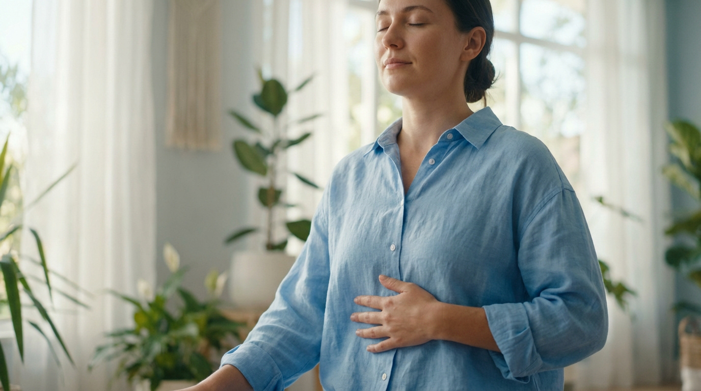 Posez une main sur votre nombril. Inspirez lentement par le nez en poussant votre main vers l’extérieur. Sentez l’air remplir le bas de vos poumons sans forcer le passage.